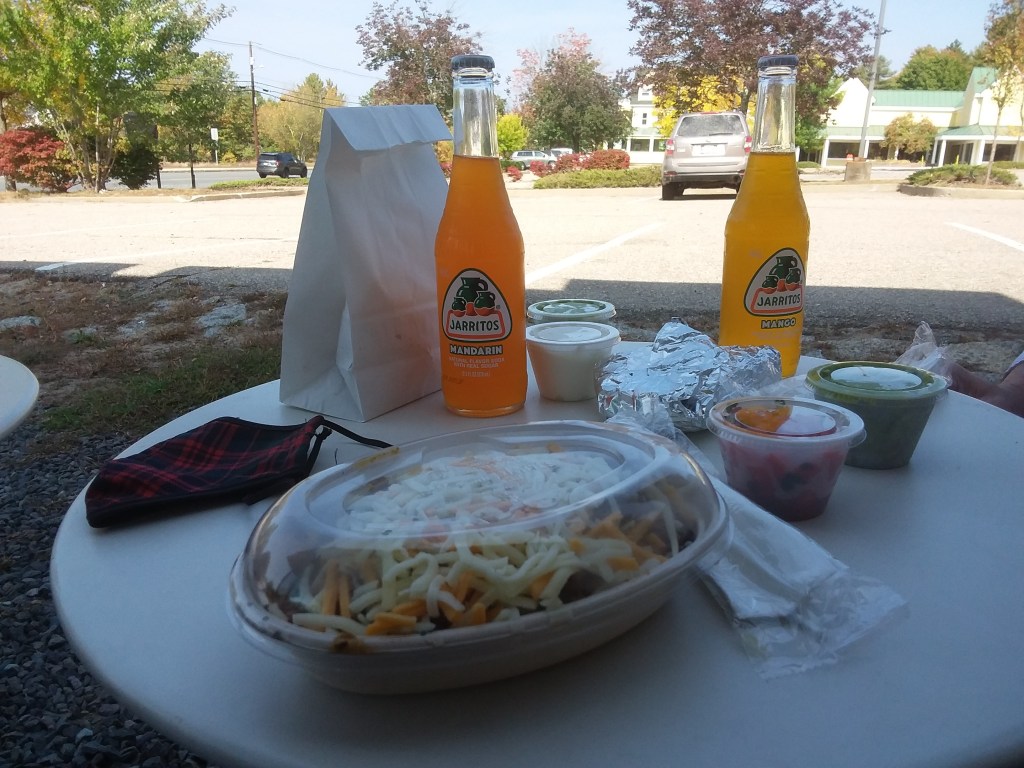 We ate all by ourselves at a shady outside table. Macdonald had a cheese quesadilla with guacamole and pico de gallo on the side, and I had a pork burrito bowl with all the usual burrito stuffings minus the tortilla. We also had Jarritos Mexican soft drinks to go with, plus extra chips and – you guessed it – guacamole.